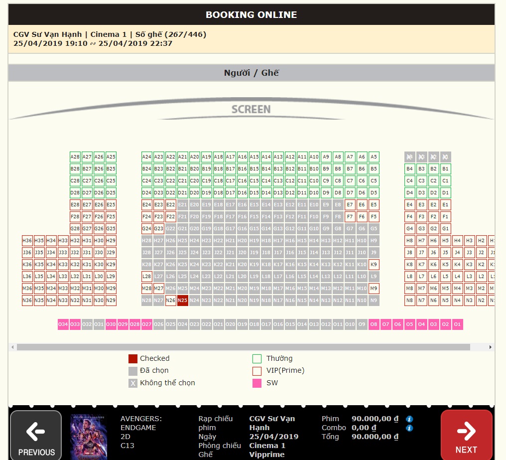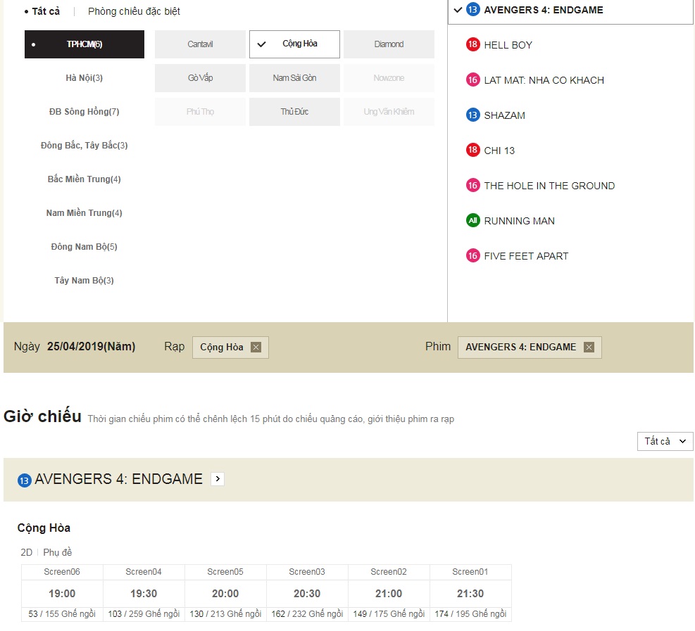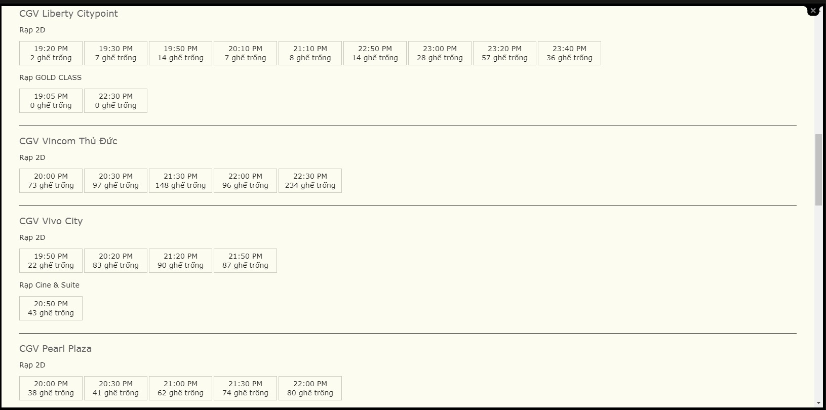 Đến tối ngày hôm qua thì bạn đã bắt đầu có thể đặt được qua apps và website, tuy nhiên vừa mới đặt chỗ thôi, chưa kịp thanh toán tiền thì bạn đã bị out ra vì vé đó đã sold out hết. Tình trạng này cứ lặp đi lặp lại nhiều lần làm cho khách hàng cảm thấy hơi bị bực bội và cảm thấy được độ hot của bộ phim này kinh dị như thế nào. Đến sáng nay thì cơ bản là việc đặt vé trên 2 hệ thống gián tiếp này của CGV đã ổn định, tuy nhiên đa phần không có suất chiếu nào lúc 19h00 -19h30 ngày 25/4/2019 ở các rạp trên cả nước còn vị trí đẹp nữa hết.