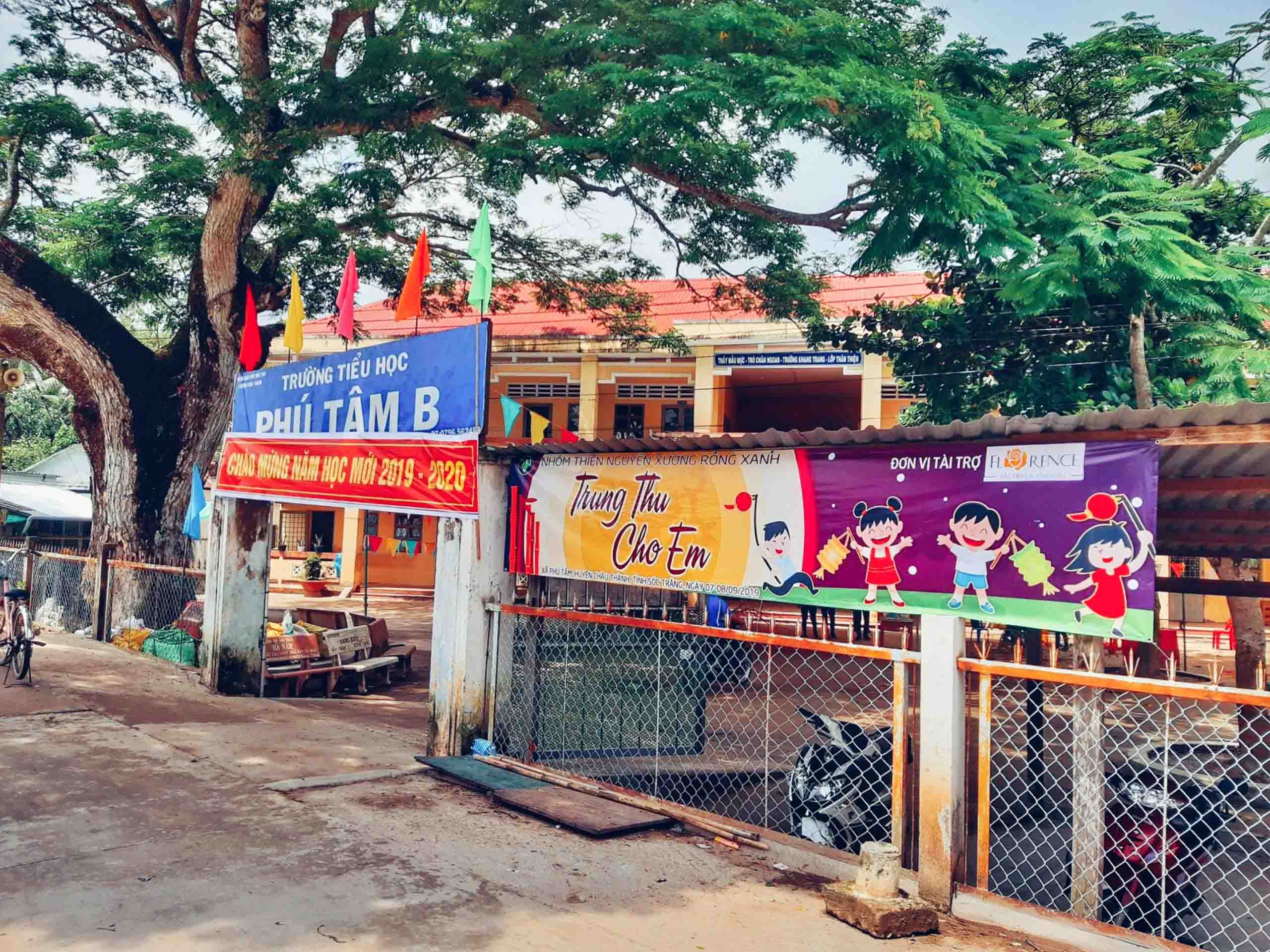 Đi bộ khoảng 25 phút, Trường Tiểu Học Phú Tâm B đã hiện lên trước mắt tụi mình. Trường có một cây còng trên trăm tuổi, phủ mát cả sân trường cũ kỹ. Sau khi vận chuyển đồ từ xe tải vào các lớp học, Ghiền review và các bạn chia nhau đi thay đồ, vệ sinh thân thể sau đó cùng nhau ăn những ổ bánh mì, những nắm xôi đã được chuẩn bị từ trước. Mọi người lúc này còn xa lạ, chưa nói chuyện nhiều với nhau nhưng cũng đang tự mình có những suy tư về chương trình sắp đến.