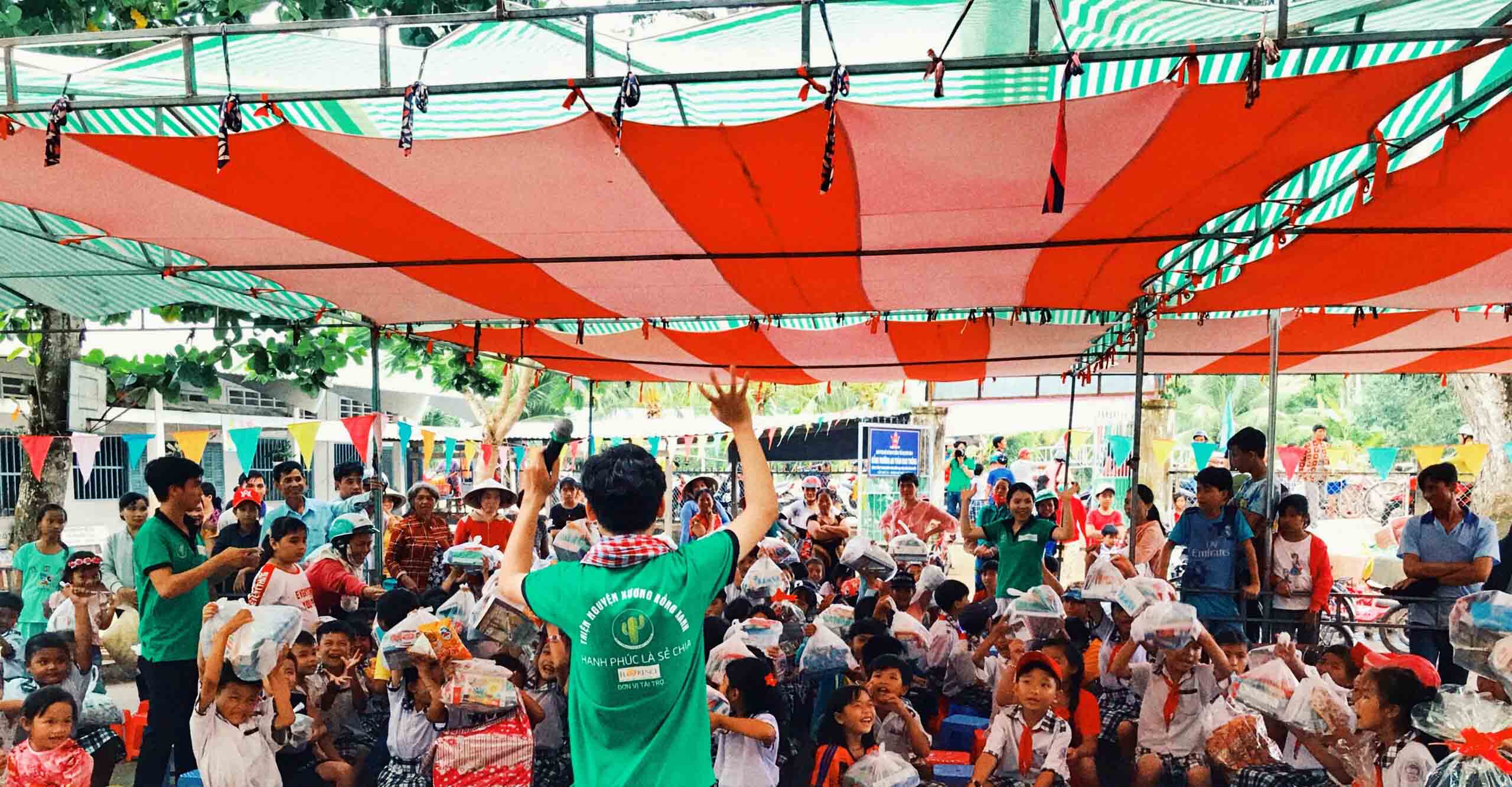 Đúng 13h30, chương trình Trung Thu Cho Em chính thức bắt đầu. Các em học sinh đã ngồi ngay ngắn trước lá cờ tổ quốc như những buổi sáng đầu tuần, chỉ khác là người đứng trước các em bây giờ không phải là thầy cô mà là các anh chị từ Tp. Hồ Chí Minh đến. Tụi mình hâm nóng các em bằng những trò chơi và một vài câu đố vui nho nhỏ, sau đó là phần nhảy tập thể khởi động tinh thần và sự hứng thú của các em. Mới những phút đầu thôi mà các em đã chơi cực kỳ hết mình, gương mặt mọi người ai cũng bừng sáng những nụ cười rất tươi, mặc cho mưa vẫn bay bay ở trên đầu.