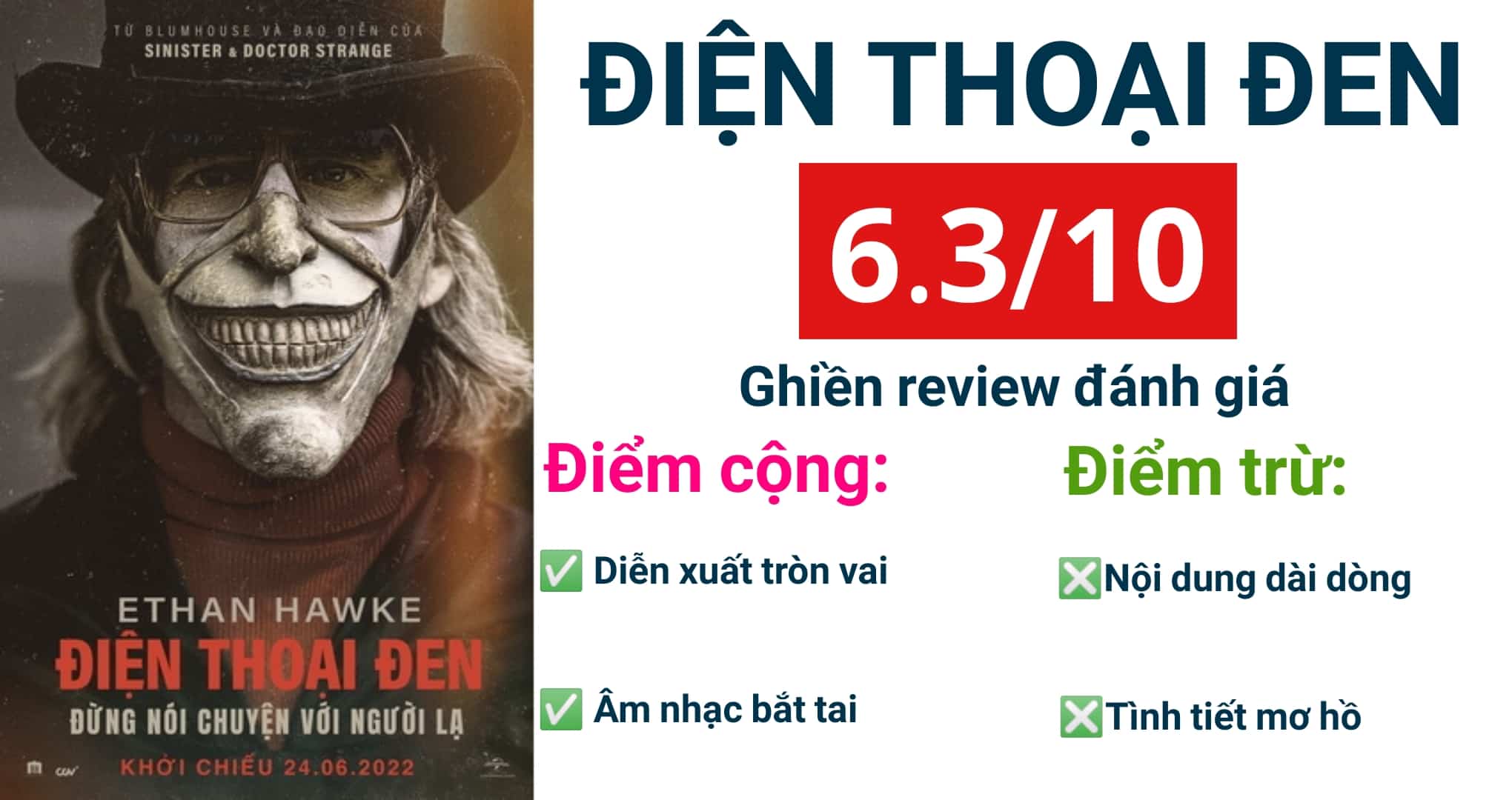 Nhìn chung, Điện thoại đen là một bộ phim kinh dị có độ đáng sợ ở mức trung bình với một vài phân cảnh hù dọa theo hướng jump scared. Mọi thứ trong phim được kể tương đối lê thê dài dòng nhưng vẫn tạo được sức hút đối với người xem. Cảm giác xem Điện thoại đen không bị nhàm chán nhưng cũng chưa đủ đột phá để gây ấn tượng với khán giả, đặc biệt phim vẫn để lại rất nhiều dấu hỏi rất lớn vì các tình tiết chưa được giải thích thỏa đáng. Hãy cùng Ghiền review phân tích những điểm mạnh và điểm yếu của Điện thoại đen để hiểu hơn về phim các bạn nha.