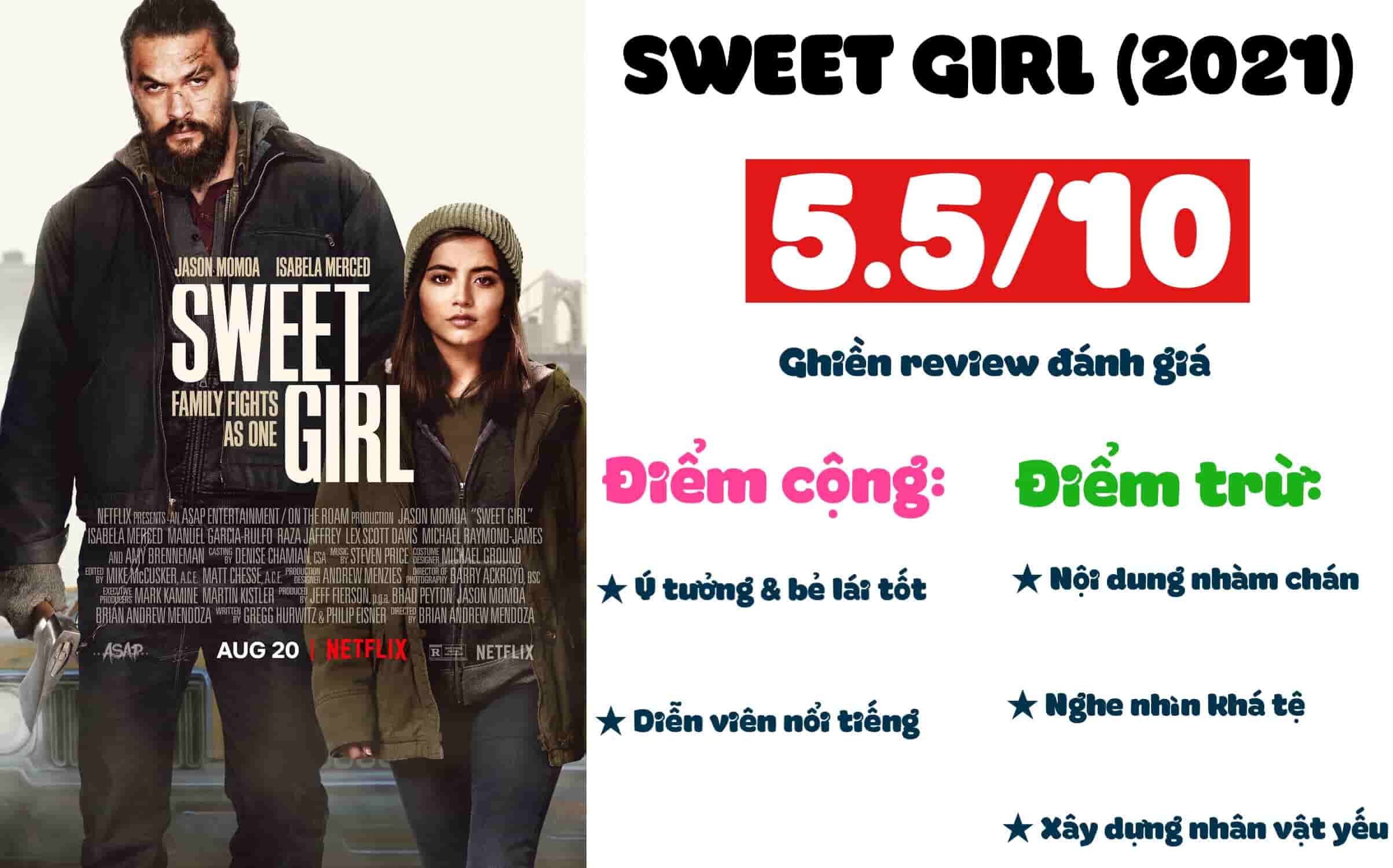 Tóm lại, Sweet Girl (2021) là một bộ phim không hay như trailer của nó và tiếp tục làm khán giả hoài nghi về chất lượng các phim lẻ thuộc thể loại hành động do Netflix sản xuất. Mặc dù phim sở hữu ý tưởng tốt, bẻ lái bất ngờ và dàn diễn viên chất lượng nhưng nội dung, phần nhìn, phần nghe và cách xây dựng cũng như phát triển nhân vật lại quá yếu khiến cho bộ phim trở nên nhàm chán và kém hấp dẫn trong mắt người xem.