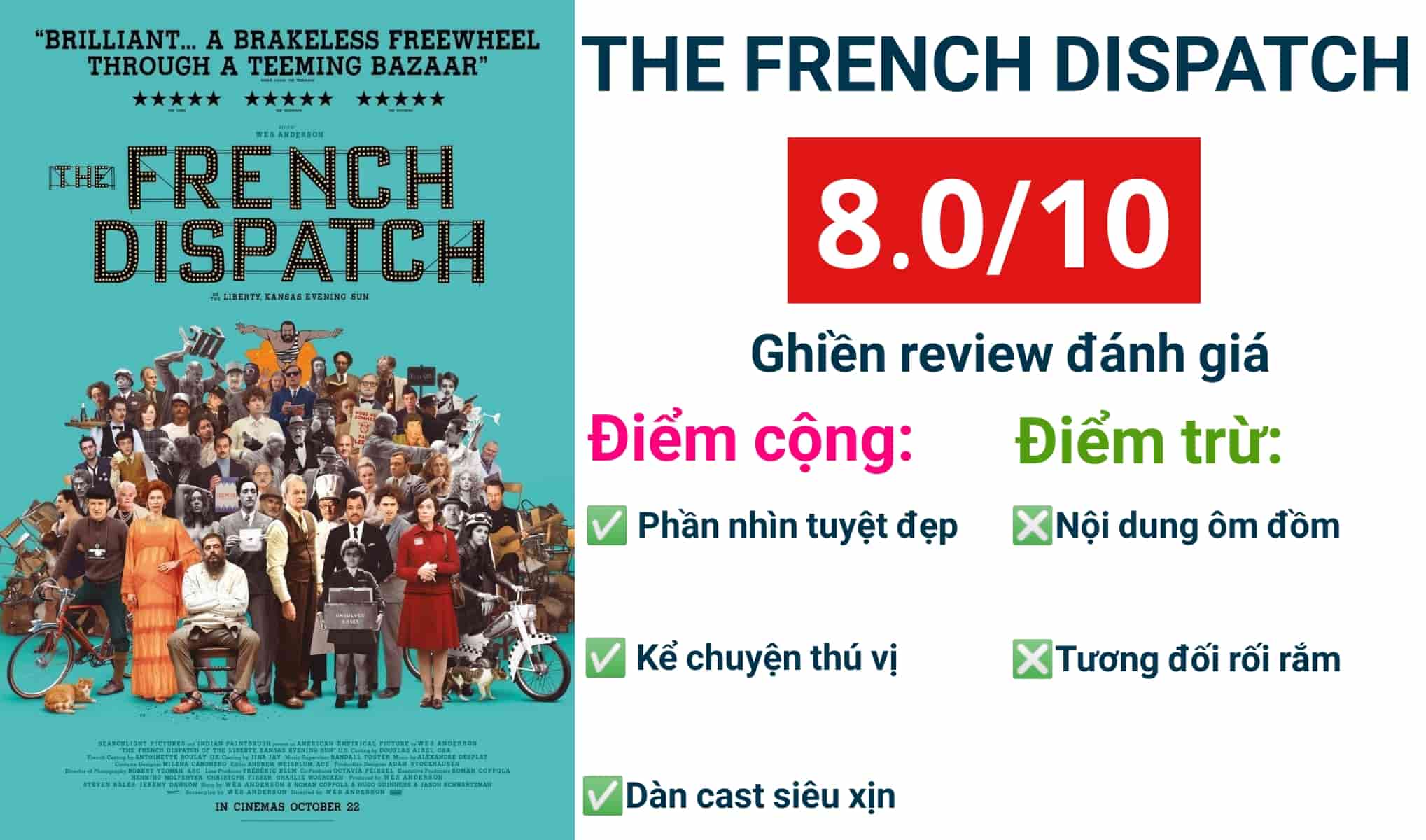 Nhìn chung The French Dispatch là một trải nghiệm điện ảnh vô cùng thú vị nhưng không hề dễ xem. Phim mê hoặc khán giả bằng phần nhìn mãn nhãn đến nỗi mà khán giả chỉ muốn ôm chầm lấy từng khung hình để ngắm trọn vẹn vẻ đẹp của phim. Lối kể chuyện đầy sáng tạo và hài hước mang đến sự duyên dáng và lôi cuốn đến kỳ lạ. Tuy nhiên phim được kể với tiết tấu nhanh, đan xen nhiều tình tiết, nhân vật và trình tự thời gian lộn xộn có thể khiến khán giả rơi vào cảm giác bội thực thông tin và mơ hồ với những gì đang diễn ra. Hãy cùng Ghiền review phân tích sâu hơn qua việc tìm hiểu những điểm mạnh và điểm yếu của phim các bạn nhé!