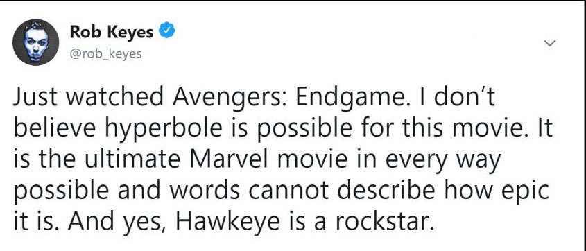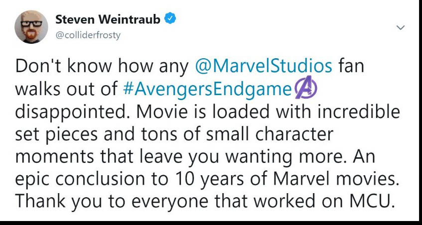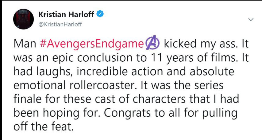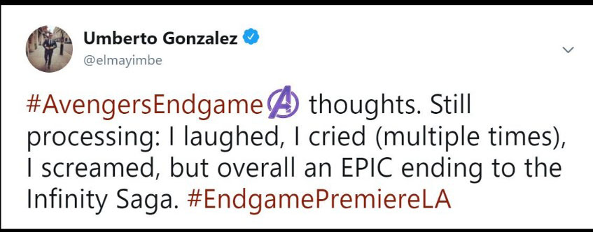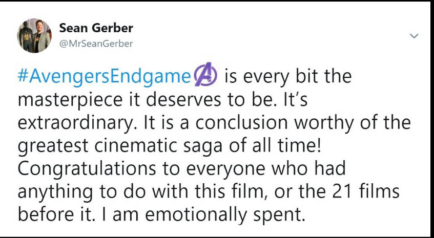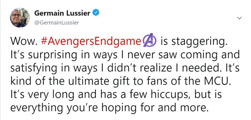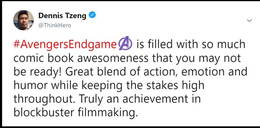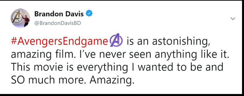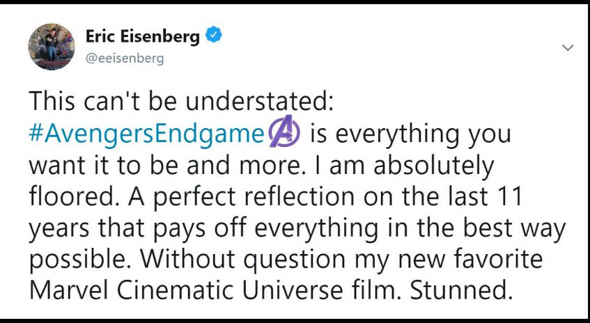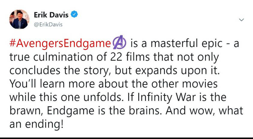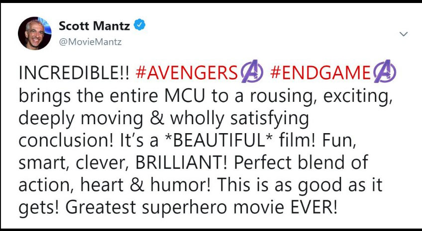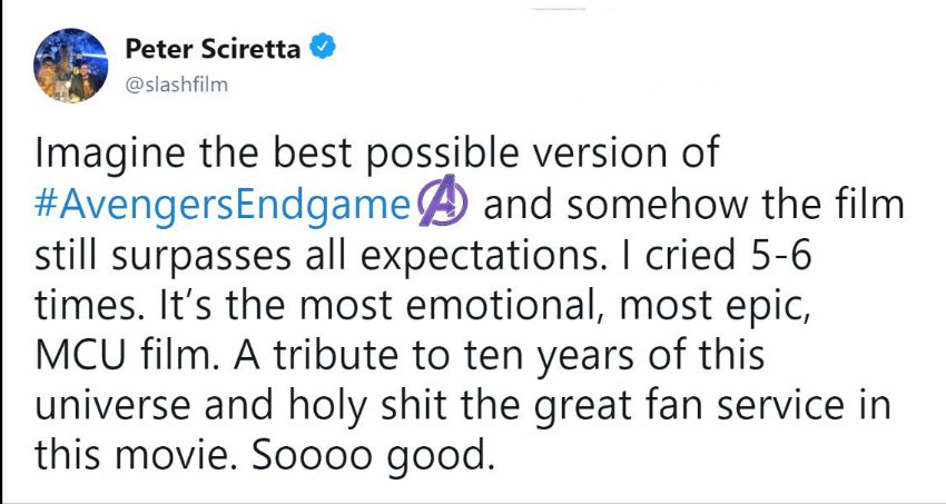Đa phần các reviewer đều phải thốt lên rằng phim quá hoành tráng, xúc động và là một cái kết tuyệt vời cho chặng đường 10 năm của vũ trụ Marvel. Họ cho rằng phim hay hơn họ nghĩ rất nhiều lần và Avengers: Endgame thực sự là bộ phim mà họ yêu thích nhất của MCU. Ôi đọc đến đây thôi là đã thấy sướng hết người và càng mong chờ hơn đến 19h00 ngày thứ 5 tuần này để xem phim phải không nào các bạn. Cùng đọc một số chia sẻ trên Twitter nha: