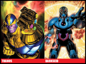 Darkseid xuất hiện lần đầu vào năm 1970. 3 năm sau, Thanos của Marvel được giới thiệu tới độc giả. Cả hai nhân vật bá đạo này đều là những á thần, siêu ác nhân nắm trong tay quyền sinh quyền sát của cả vũ trụ. Ban đầu Jim Starlin, tác giả của Thanos ban đầu định xây dựng Thanos theo kiểu ngồi ghế dựa như một nhân vật của DC nhưng một biên tập viên của Marvel đã nói với Jim Starlin rằng: “Nếu anh có ý định chôm chỉa gì từ DC, ít nhất phải lấy “hàng xịn” như Darkseid ấy chứ”.