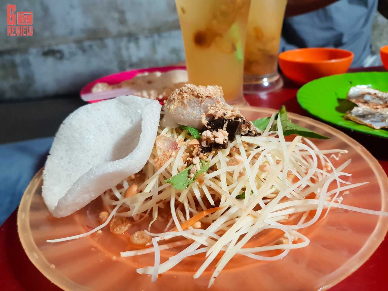 Sau đó, tụi mình về lại khách sạn tắm rửa, chờ phố lên đèn thì lên đồ đi chơi. Ở đây, đặc sản phải thử là món gỏi lá (món ăn kết hợp thịt heo, tép, muối hột, ớt, tiêu khô và rất nhiều loại lá rừng khác nhau) á các bạn, theo như người ta nói gỏi lá là món ăn thú vị bậc nhất ở Châu Á lun á. Nguyên con đường Trần Cao Vân, chỗ nào cũng bán món ăn này, tụi mình vào đại quán Yến Vy để thưởng thức 1 phần gỏi lá với giá 200k/phần. Thực tình cũng không ngon lắm đâu, nhưng ăn là lạ, kèn theo chút rượu nồng trong cái tiết trời lành lạnh nên thấy cũng ok á. Các bạn phải tự trải nghiệm mới có thể đánh giá được.