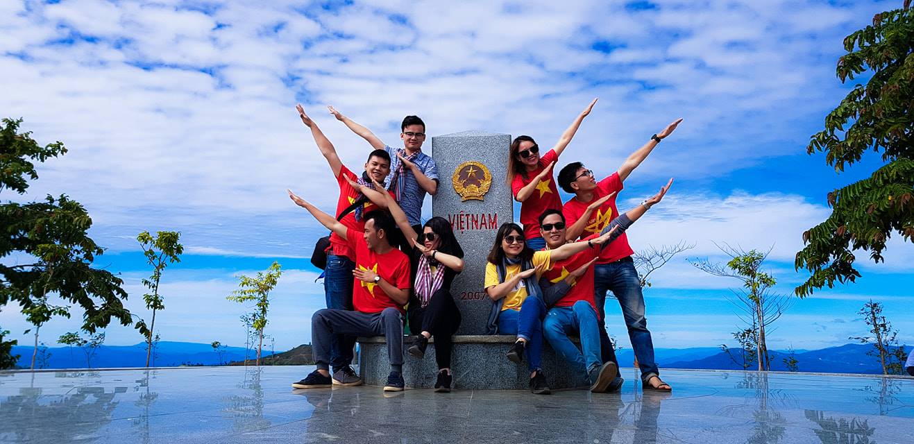 Tụi mình xuất phát từ lúc 7h sáng, dùng điểm tâm để nạp năng lượng sau một buổi tối hết mình tại một quán ven đường. Từ thành phố Kon Tum lên đến Thị trấn Ngọc Hồi tầm 60km, sau đó đi thêm tầm 20 km nữa là đến được Ngã Ba Đông Dương. Đường đi lên cột mốc giờ đã được làm đường nhựa hết, đẹp và êm vô cùng. Trước khi chạy xe lên cột mốc, các bạn ghé vào trạm biên phòng ở ngay dưới cổng vào để đăng ký và mua ủng hộ các anh một vài cái áo lưu niệm (nếu thích) nhé. Cột mốc nằm ở độ cao 1.086 m so với mực nước biển nên các bạn leo tầm 100 bậc thang là lên đến nơi rồi.